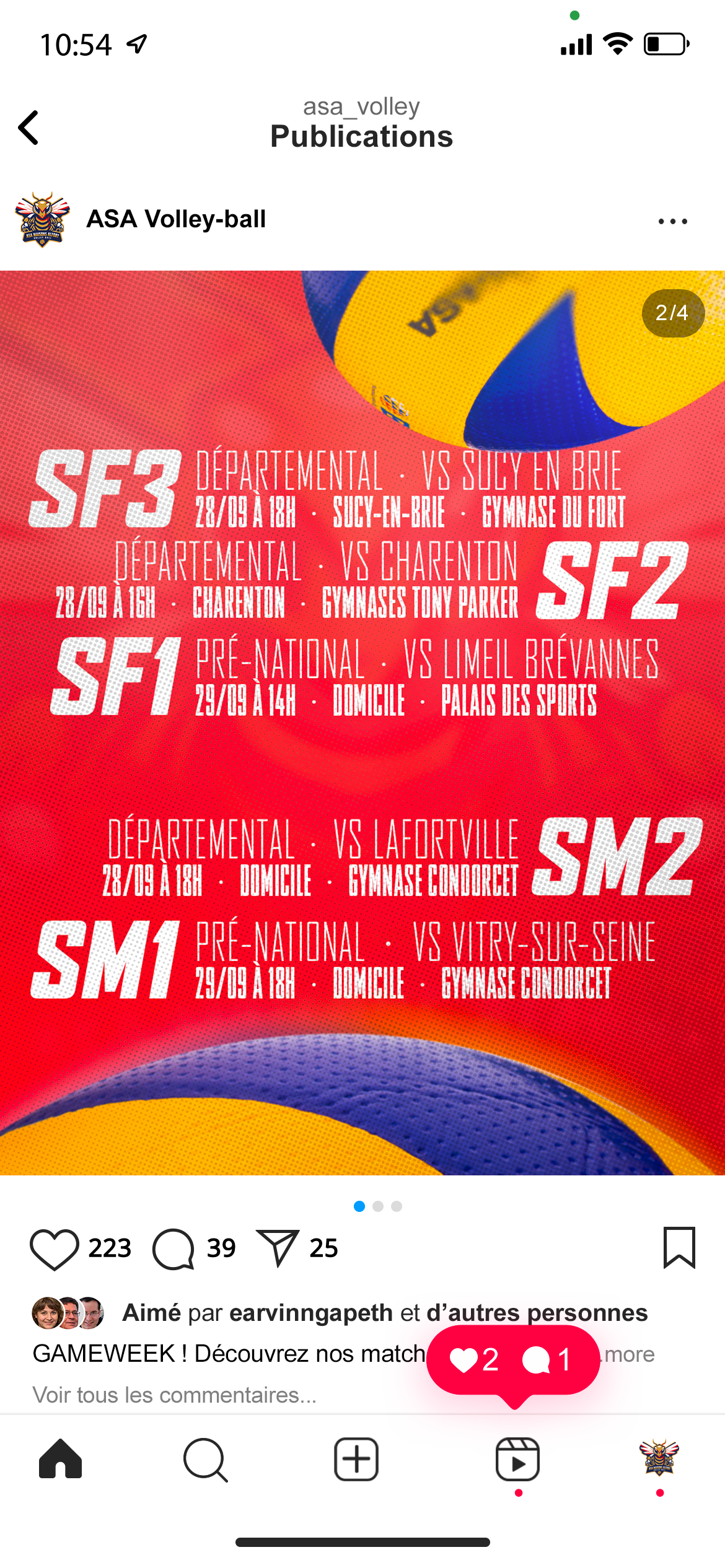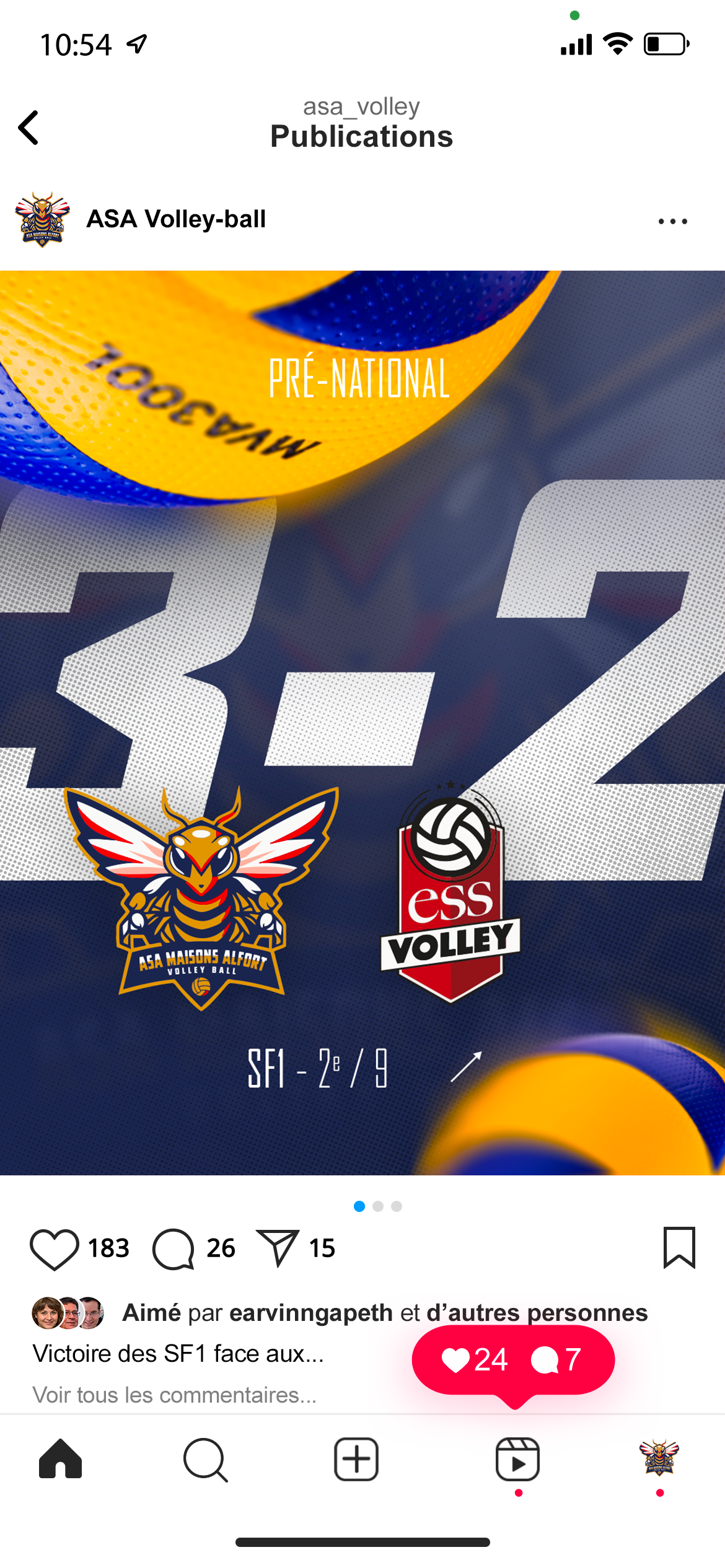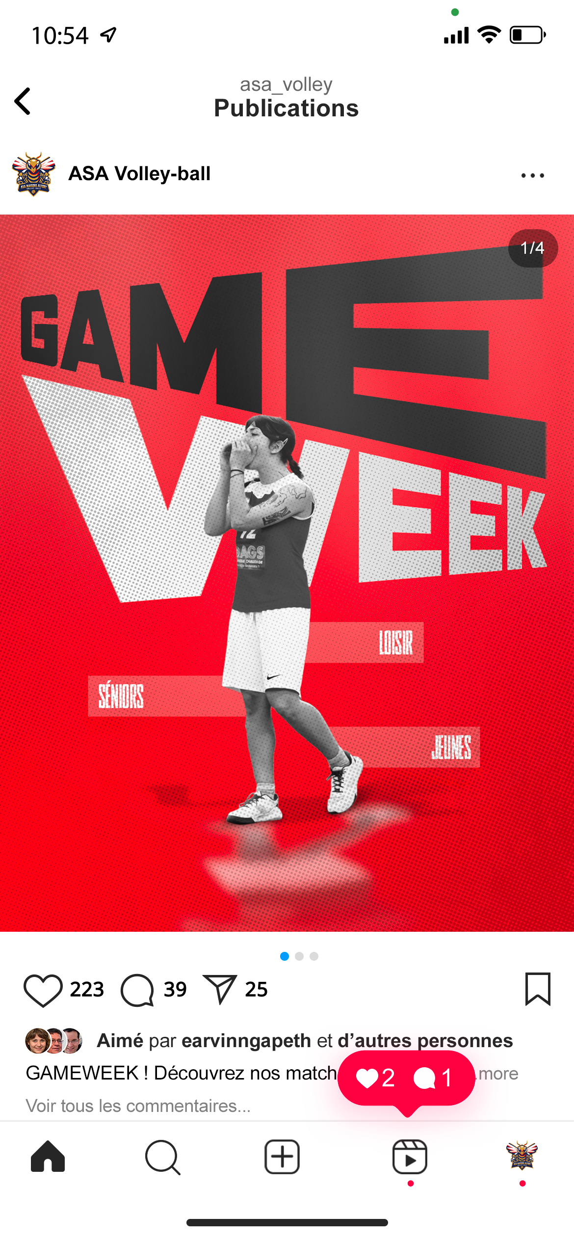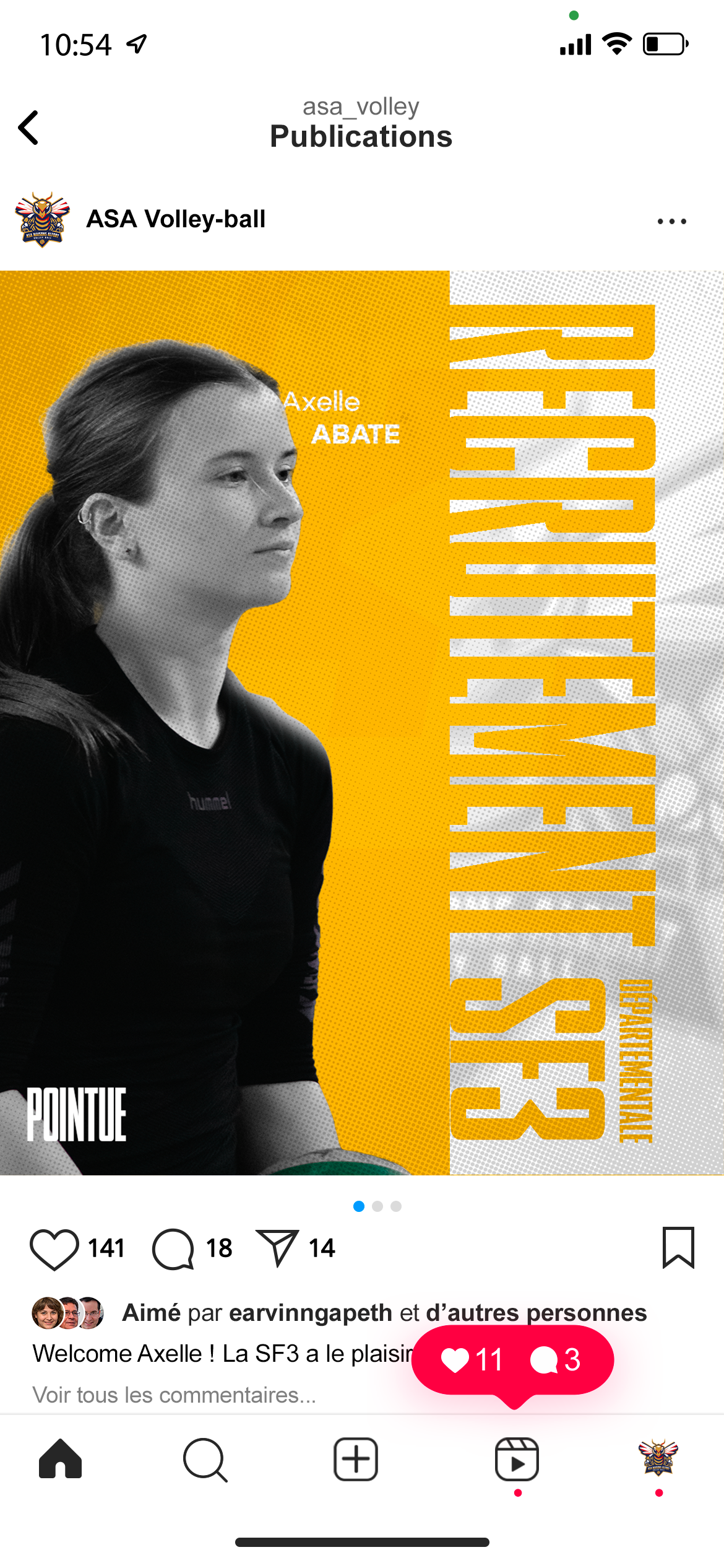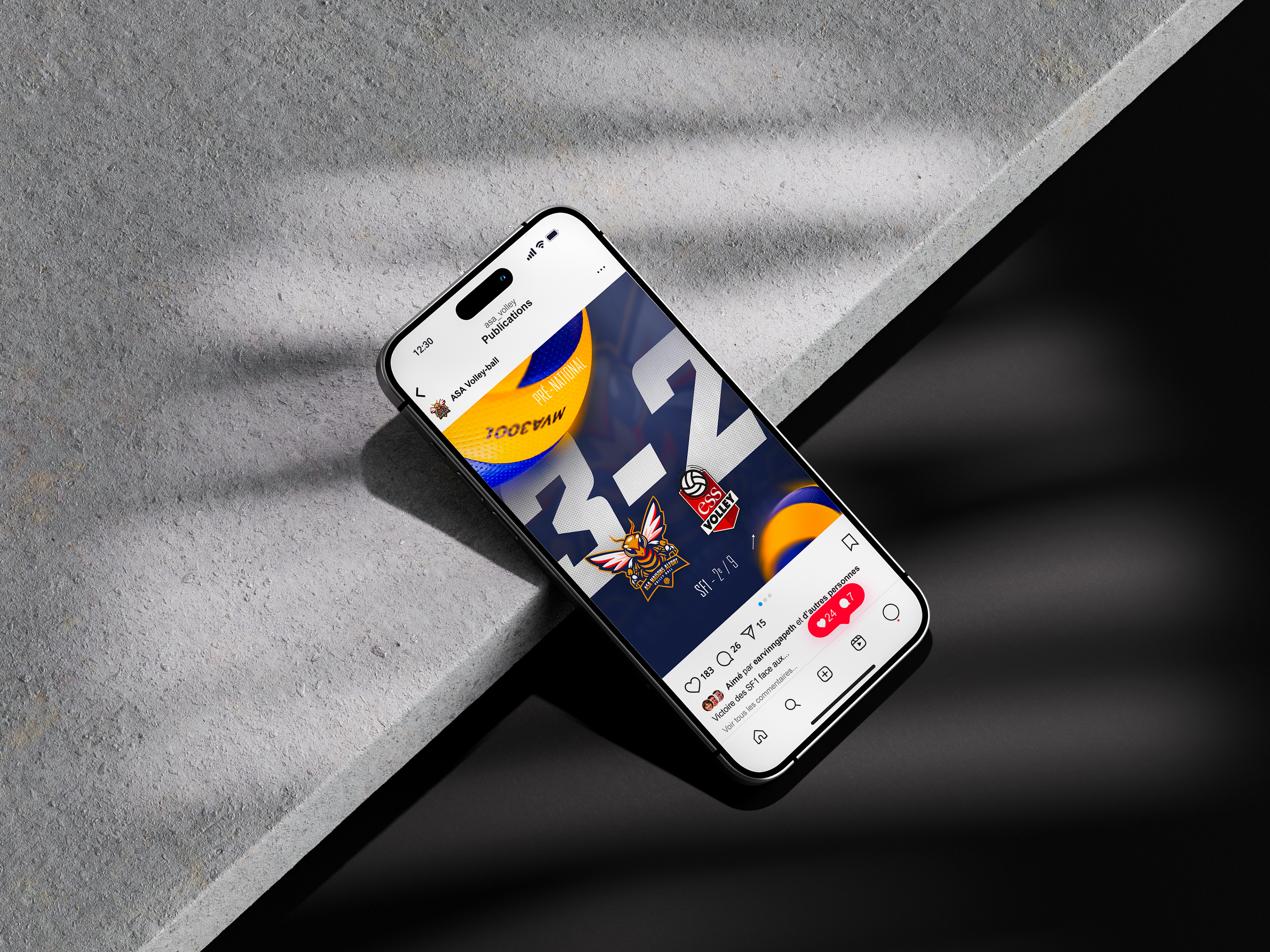 Cette proposition à été crée à partir de photos que j'ai moi même pris, j'ai créé une refonte du compte instagram de l'ASA Volley. On retrouve 3 types de publications : recrutement, annonce de matchs, et annonce de victoire/défaites.